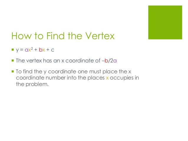 Y = ax^2 + bx + c Solutions are x-intercepts of this parabola • The solution is. By the formula given above, the x-value of the vertex of the parabola is. Differentiate using the #color(blue)"power rule"#.