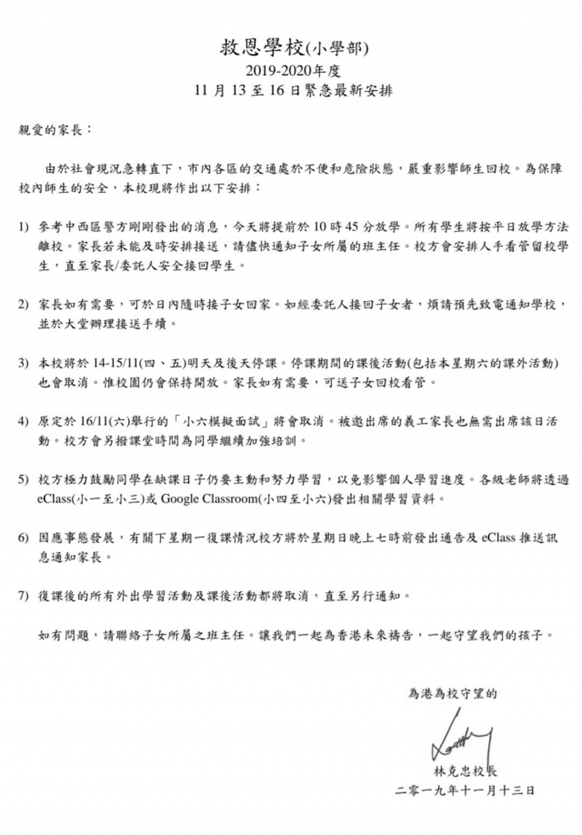 11 13三罷 救恩學校通告 按警方消息今日提早放學本周停課 香港01 社會新聞