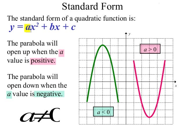 The standard form of quadratic function is:. The graph of ax + by = c is a straight line going through the points (0, c/b) and (c/a, 0). Nbp.1 I can graph ax2 + c equations.