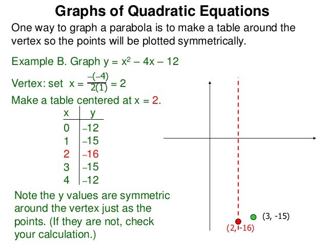 2 y = x 2 - 1 = x 1/2 = x For y = 2:. To figure out what x-values to use in the table, first find the vertex of the quadratic equation. 5) C (2,-3) 6) D No Solution.