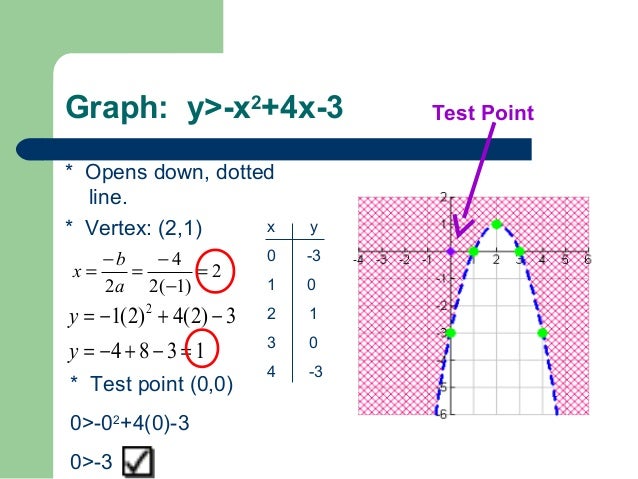 Complete the square for. If you really did mean `y<2x^2+4x-3`, the graph is the same, but with a dotted line instead of a solid one, and then shaded below the parabola. The axis of symmetry is latexx=-\frac{4}{2\left(1\right)}=-2./latex This also makes sense because we can see.