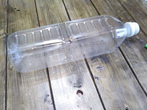 ペットボトルの側面 下の方 にコンパスの針で穴あけ水遊びじょうろ こどもとおもちゃと4コマ育児